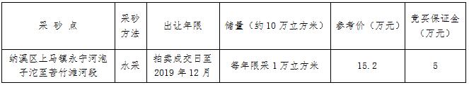 我公司受委托,于2017年4月6日上午10時在納溪區(qū)公共資源交易中心面向社會公開拍賣瀘州市納溪區(qū)上馬鎮(zhèn)永寧河泡子沱至苦竹灘河段采砂點(diǎn)的采砂權(quán)。具體事項公告如下: